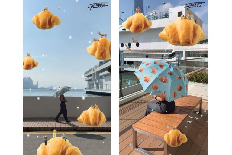 今次田中達也特別為海港城設計「牛角包雲」IG 濾鏡,分別有下雨及下雪兩款場景。希望大家不論晴天或是雨天,只需打開海港城X田中達也「牛角包雲」IG 濾鏡,都可以隨時隨地看到高掛在天空的「牛角包雲」,一起將快樂味道拍下來散播到每個角落!