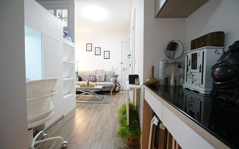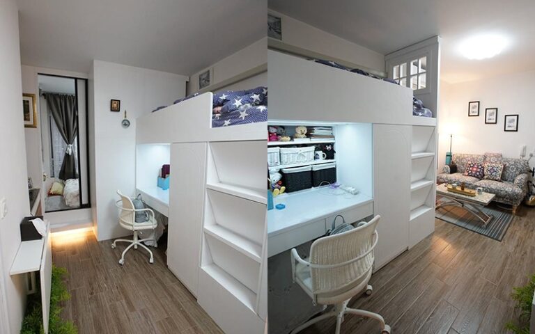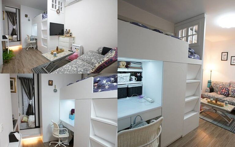 由於面積有限,未能間房,設計師將其中一張睡床改為雙層形式,以電視作分隔,劃分客廳範圍。睡床下層為書桌,遠離客廳,可專心工作或學習。再往內走便是主人房,不過房間細小,只可放置雙人床及衣櫃,沒有多餘空間,連房門也用了趟門設計,更加慳位。