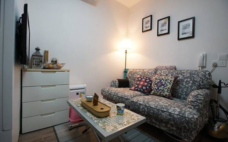 屋主喜歡田園悠閒風格,梳化、cushion和茶几都選了碎花圖案,配上柔和黃燈及木地板,顏色和諧溫暖。