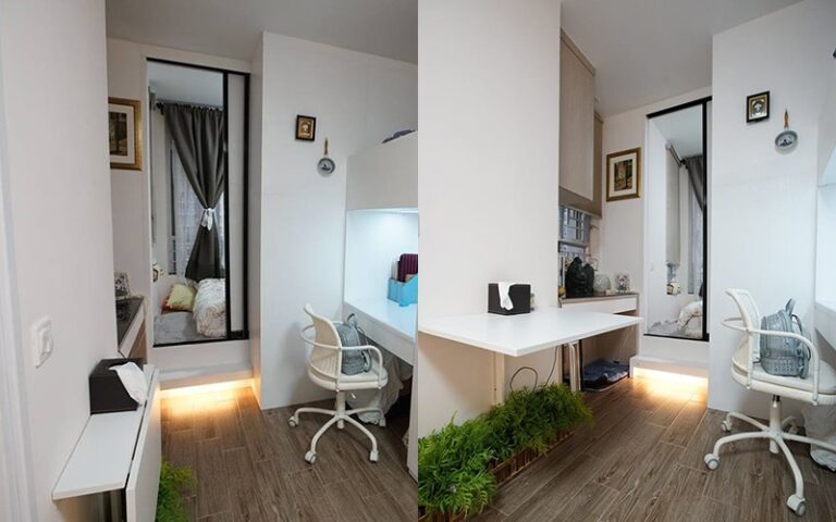 由於主人房未有空間放置梳妝枱,所以女主人的扮靚位置改為門外小窗台。下面更放置數張椅子,不用時疊起藏於台下,非常慳位!