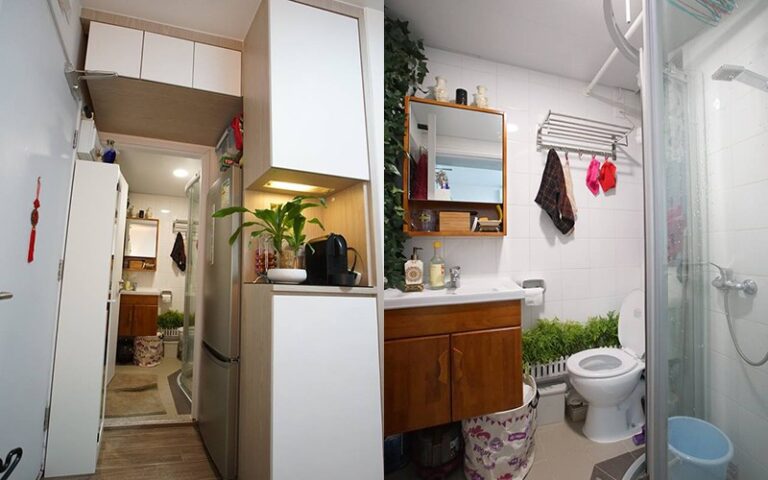 為增加儲物空間,設計師向高空發展,在大門入口處及天花設置儲物櫃。這樣亦可避開在主廳設置大型櫃,以免有壓迫感。玄關位及廁所也有小植物,貫徹全屋風格。