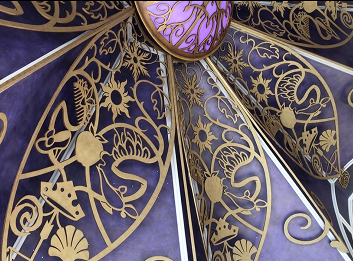 三個值得留意的仔細位,同樣是在城堡裡面,不過是背面的小房頂。從城堡背面的入口,會有一座圓形房頂,抬頭望上去就會發現會一塊塊金屬裝飾呈花瓣形擺放,而金屬裝飾的設計同樣都是融入了多位公主及女皇的特徵,來試試認出所有的角色吧!另外,旁邊的石柱上其實也是精心設計,暗藏巧妙,參觀時也可以多留意!