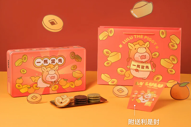 盒上超人氣的罐頭豬LuLu,披上「駿」俏頭套,扮作馬仔,向大家送上大吉大利的祝福。盒內的經典蝴蝶酥及伯爵、伯爵曲奇、朱古力曲奇味道俱全,讓人回味無窮,加上超可愛的包裝設計,無論是自家享用還是作為拜年賀禮,都是絕佳之選。禮盒附送罐頭豬LuLu馬年主題紙袋及一套6個利是封,為今年的利是封選擇增加超可愛選項。