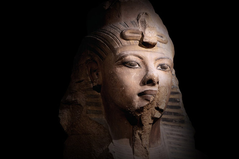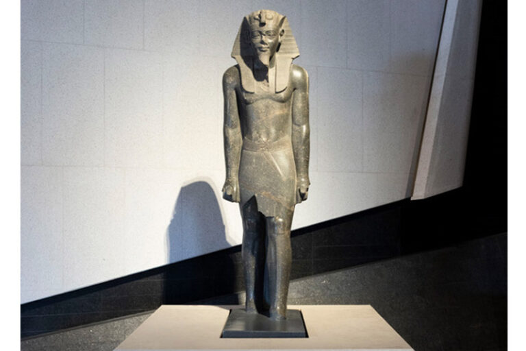 石像描繪法老拉美西斯二世之子及其繼任者麥倫普塔邁步向前,雙臂自然下垂,頭戴王室頭巾及象徵神聖王權的聖蛇標誌(烏拉埃烏斯),氣勢十足。