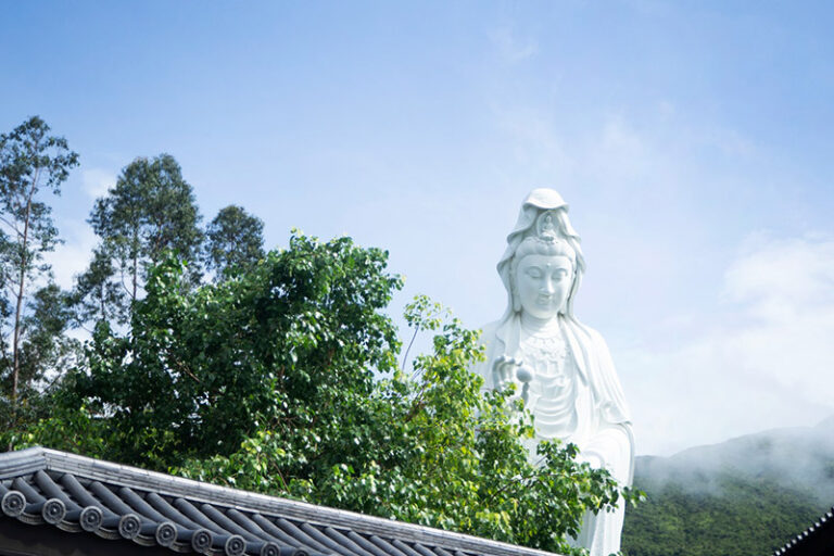 以青銅合金鑄造的素白觀音聖像高達76米,慈悲莊嚴,其右手持智慧摩尼寶珠,左手持淨瓶,施灑淨水,讓信眾獲得清淨。不同於觀光導向景點,這裡更重視修學與清淨氛圍。