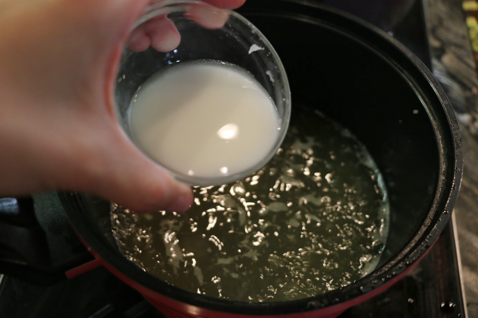 8. 待湯煮滾後倒入生粉水,將湯汁煮至濃稠。(如打算用來拌飯吃,可把湯汁煮至稠身一點,生粉水可以分次加入,直至煮到自己合適的濃度。)