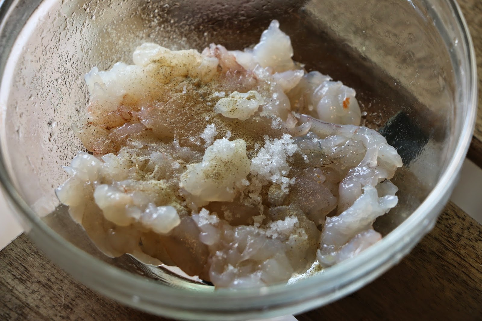 1. 蝦仁加入1茶匙鹽抓匀,再用清水沖洗乾淨。