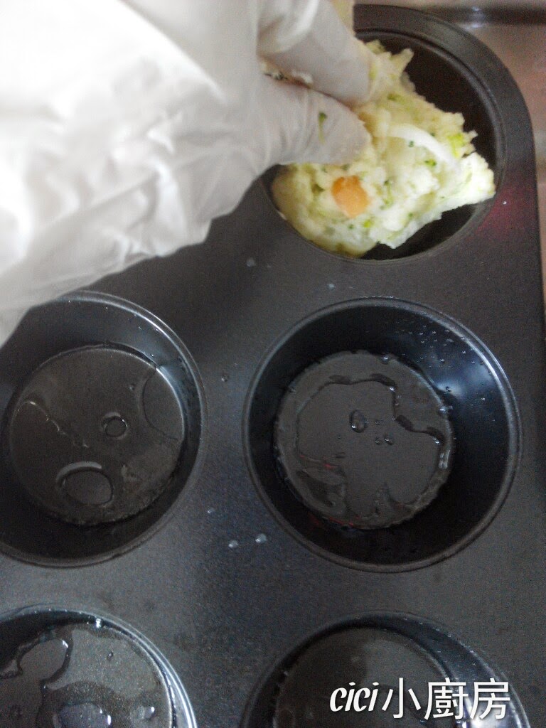 將薯蓉搓成球狀,放進模裡,用手壓實。