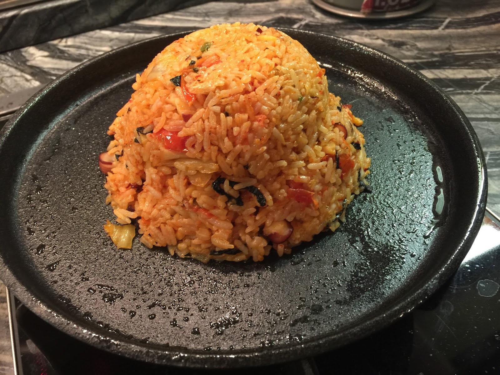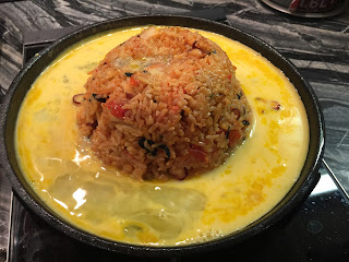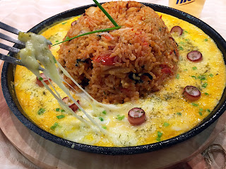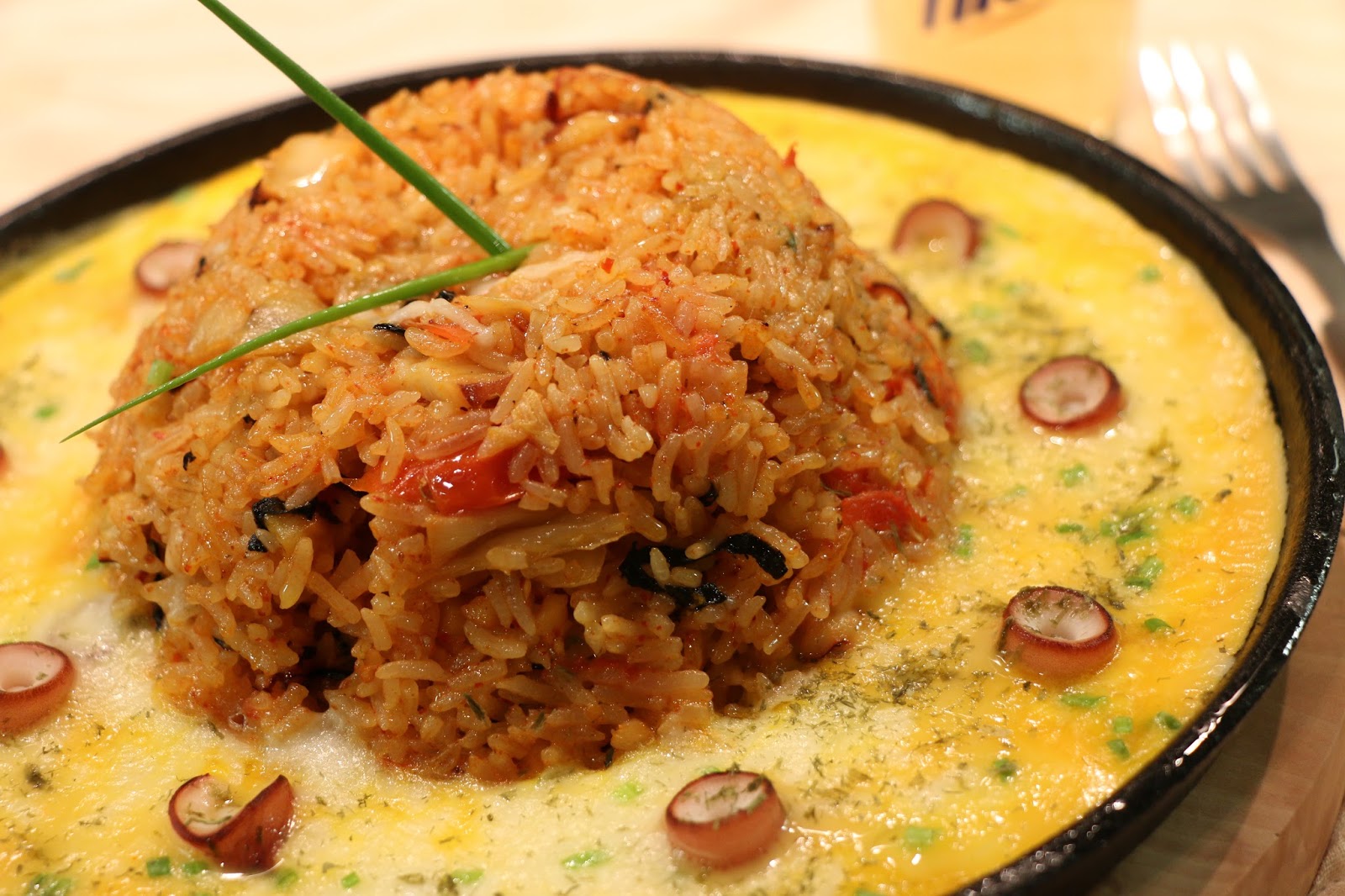 章魚泡菜熔岩蛋漿炒飯,熱辣辣的鐵板把芝士溶化,加上半熟的蛋汁包着飯粒,入口真的很香滑。