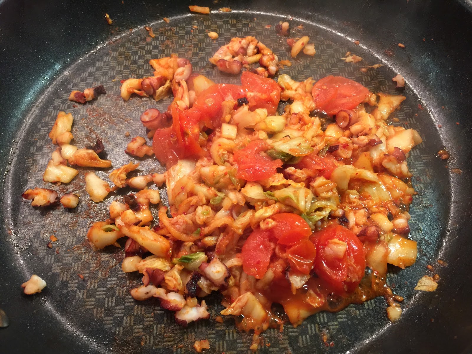 2. 炒鍋中加少許油燒熱,放入章魚、番茄和泡菜炒至番茄溶爛。