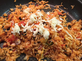 5. 炒至所有飯粒也沾滿了醬汁後,加入紫菜絲和少許芝士絲續炒至芝士熔化,熄火。