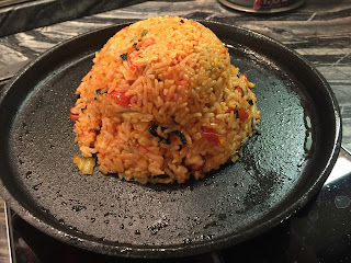 8. 圓鐵板掃上一層油,並加熱至高溫。然後將炒飯倒扣在鐵板中間,用匙稍在頂部壓一壓,形成一個小火山洞。(因怕飯鬆散,我並沒有壓太深。)