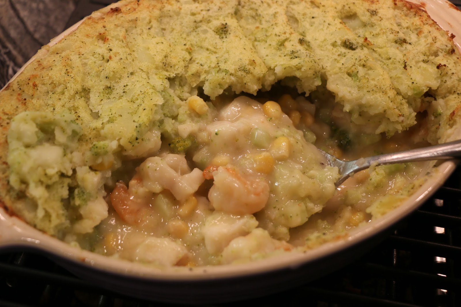 簡介用白魚柳、蝦仁、粟米粒、西蘭花(綠花椰菜)製作饀料批,上面再鋪上一層用西蘭花製成的蔬菜薯蓉,烤過後的薯蓉再配上饀料吃,非常美味。