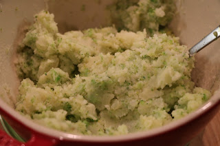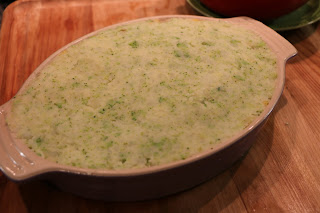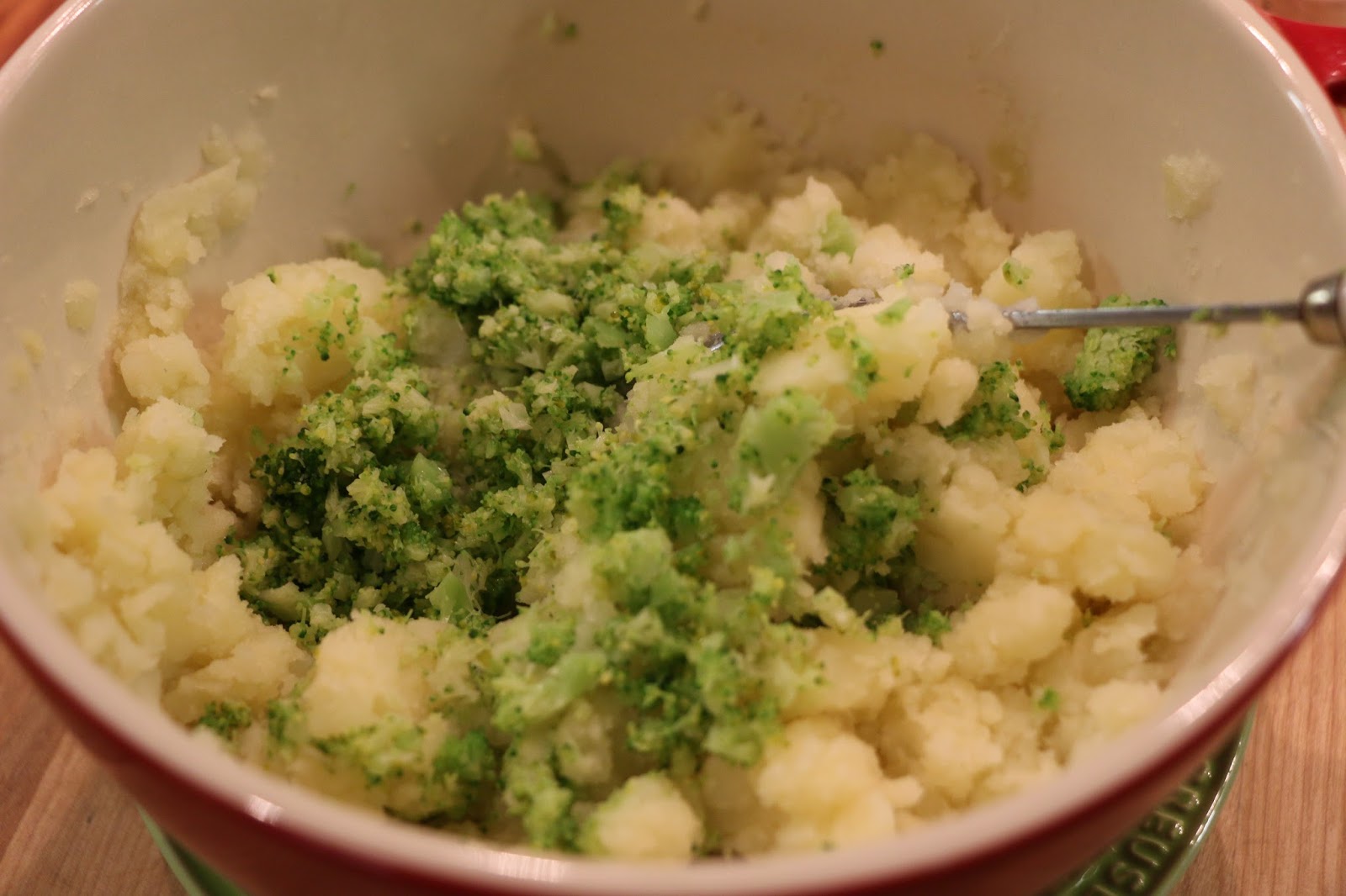 5. 加入1大匙牛油拌勻後,放入鮮忌廉、西蘭花碎和少許鹽再攪勻成蔬菜薯蓉。