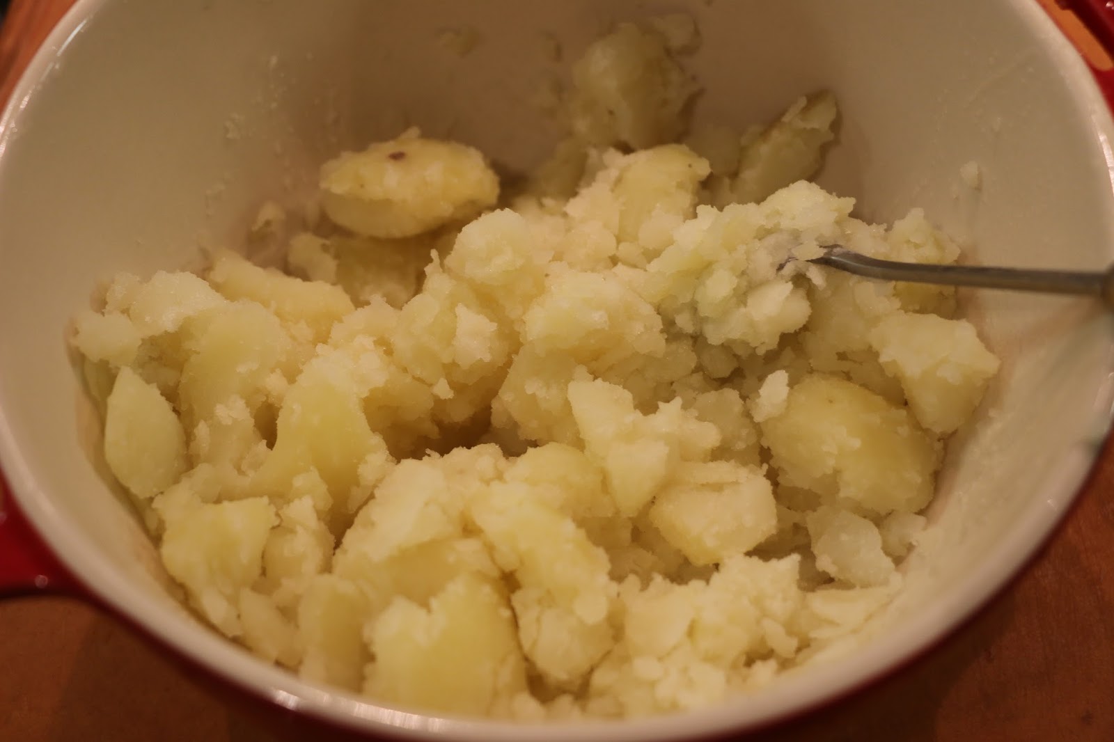 4. 將煮好的馬鈴薯去皮,放入碗中,用湯匙壓成薯蓉。