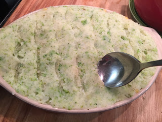 用白魚柳、蝦仁、粟米粒、西蘭花(綠花椰菜)製作饀料批,上面再鋪上一層用西蘭花製成的蔬菜薯蓉,烤過後的薯蓉再配上饀料吃,非常美味。