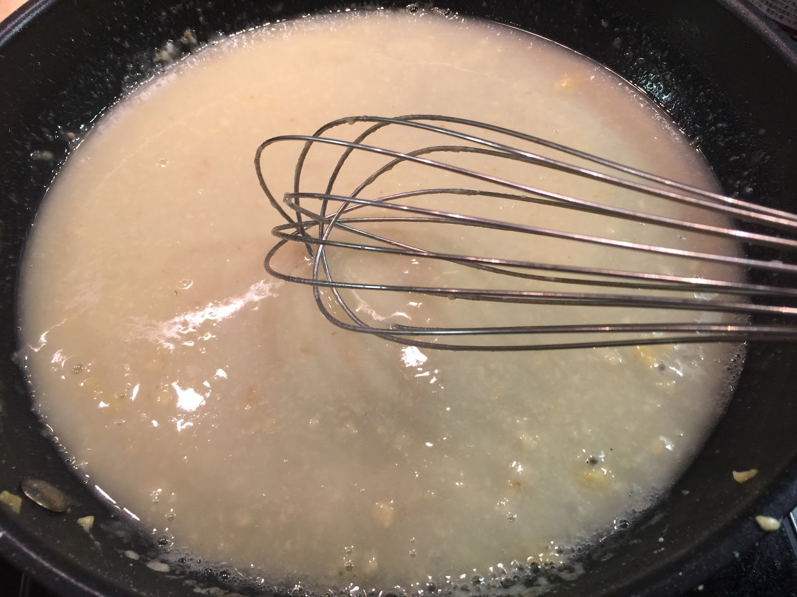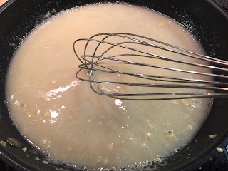 9. 然後分2次倒入清雞湯拌勻煮滾。(若汁料太稀,可酌量添加麵粉。)