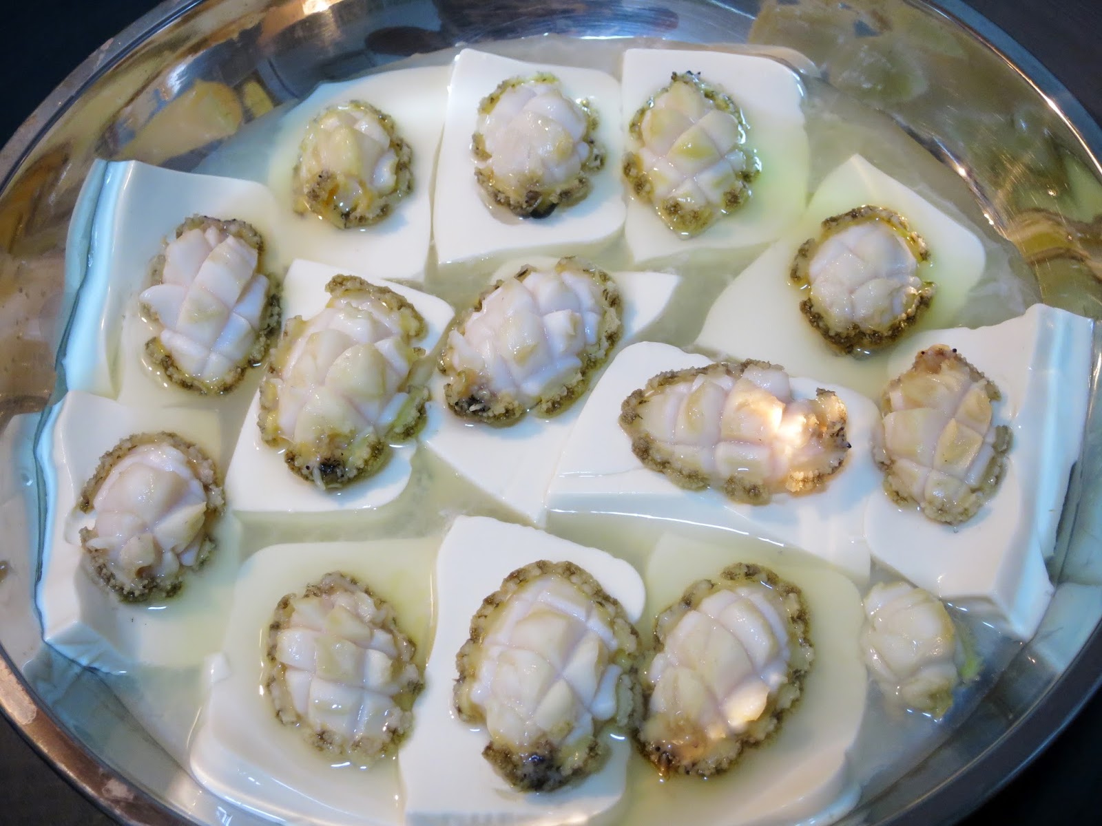 我試過唔界,又試過在鮑魚面部界,都係在鮑魚底部界較好,因為鮑魚面向底會吸住舊豆腐,唔洗好似帶子咁要加D生粉水令佢痴實舊豆腐。