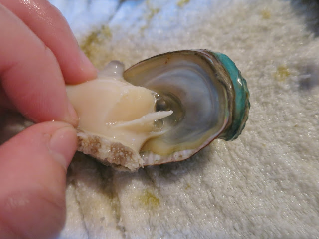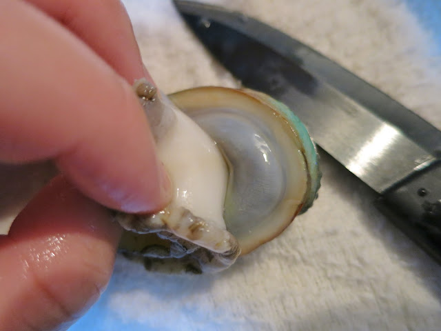起殼需要一把短小的刀,先反起鮑魚肉(有腸果邊,如圖),然後沿著鮑魚肉個邊,貼實個殼撬舊肉出黎。
