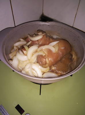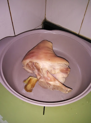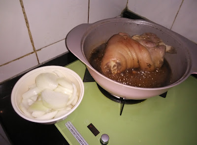 用玫瑰煲炆黑椒原只大豬手By angelma21用玫瑰煲炆黑椒原只大豬手編輯: By angelma21預備---分鐘烹調2小時30分鐘總共2小時30分鐘難度1 / 3份量3-4人簡介黑椒豬扒,牛排大家就食得多有時都可以用豬,做法都簡單但就非常好味,汁用來撈飯就更好味材料材料:豬手1只,洋蔥1個汁料:酒2湯匙,薑1件,黑椒2湯匙,老抽1湯匙,冰糖1粒做法1先將豬手解凍再用薑出水 大約10分鐘左右,滾起後就會浮出汚物 將豬手洗淨如有毛去淨放入飯煲加薑同水先煮15分鐘左右 回家將豬手先放入煲加薑先煎香2邊 煎好先灑入酒後加入黑椒,水同老抽 蓋上蓋先煮15分鐘 15分鐘後焗5~10分鐘 洋蔥洗淨切條入鑊爆香 將爆香的洋蔥加入豬手再煮10分鐘 最後試淋,如果唔夠可再多炆十分鐘,炆好加蔥就食得小貼士出水時可加入一些酒就可去雪味 炆餸一定要炆吓焗吓先會容易淋滑主菜炆燉中式肉類相關食譜孜然洋蔥雞煲By Seikobear 時間: 1 小時 30 分鐘 | 份量: 3-4人香香豉油雞By Slowdown 時間: 2 小時 | 份量: 3-4人香草檸檬蒸海鮮By 靚太Club 時間: 30 分鐘 | 份量: 3-4人