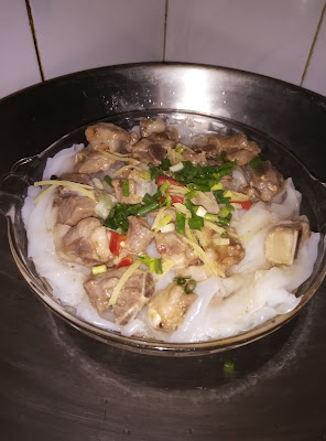 豉汁排骨陳村粉By angelma21豉汁排骨陳村粉編輯: By angelma21預備---分鐘烹調30分鐘總共30分鐘難度1 / 3份量3-4人簡介陳村粉蒸排骨唔一定要去酒樓,喺家中都可以簡單煮材料材料:陳村粉1斤,排骨$25,指天椒1只,薑絲1湯匙, 蔥粒1湯匙醃排骨料:豉油1湯匙,豆豉醬1湯匙,糖1茶匙,水2湯匙, 生粉2湯匙先將排骨洗淨加入醃料撈勻做法1先將排骨洗淨加入醃料撈勻 陳村粉用凍滾水洗洗後切細放碟底 放入排骨加椒同薑絲喺面 水滾蒸15分鐘 再焗5分鐘確保排骨熟透,最後灑上蔥粒小貼士蒸排骨一定要熟透,最少蒸15分鐘再焗5分鐘就確保排骨熟透主菜蒸煮中式肉類粥粉麵飯相關食譜譚家菜 - 瑤柱冬菇排骨有味飯By karentamm 時間: 1 小時 | 份量: 3-4人嫩雞燴麵By MicMan 時間: 1 小時 20 分鐘 | 份量: 2人瑤柱蟲草花碎肉粥By anne_tingting 時間: 40 分鐘 | 份量: 2人
