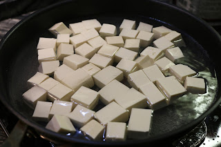 1. 豆腐切成2cm 的方塊,放入滾水中燙 1分鐘後,瀝乾水分。