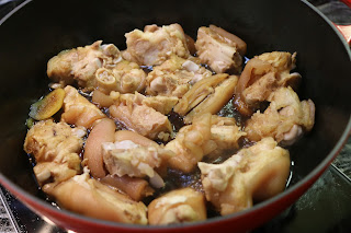 5. 然後將豬手放進去(醬汁蓋過豬手一半多),先翻炒片刻後,把豬皮朝下,改小火,蓋上鍋蓋燜40分鐘。
