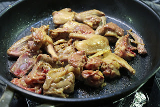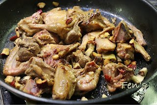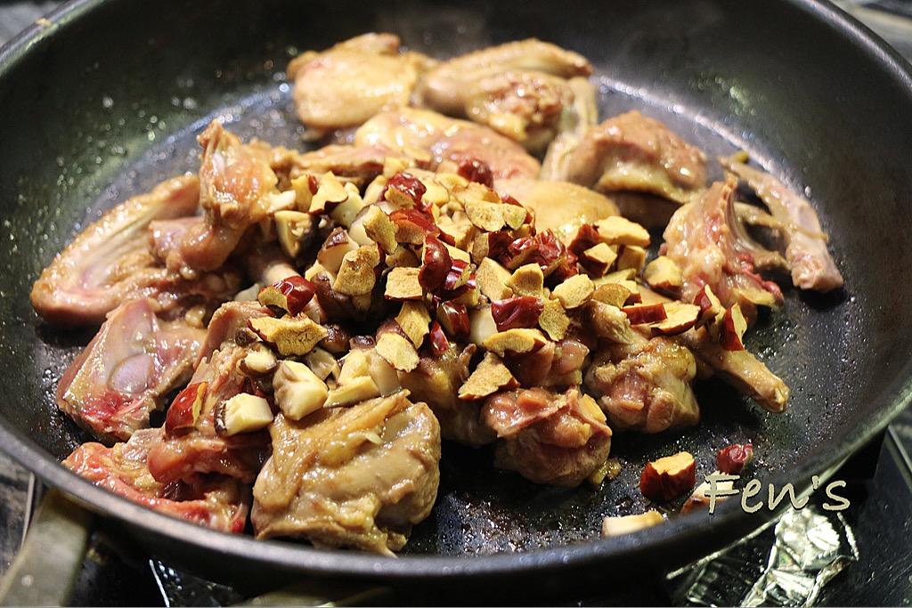 6. 加入醃過的乳鴿用中火將鴿炒至約4成熟時,加入調味料、紅棗和香菇粒炒勻,即可熄火。