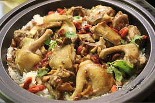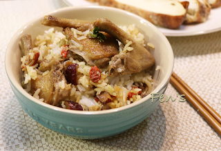 7. 米煮至水分差不多半收乾時,把炒好的乳鴿材料鋪在米面上,再放上杞子。