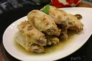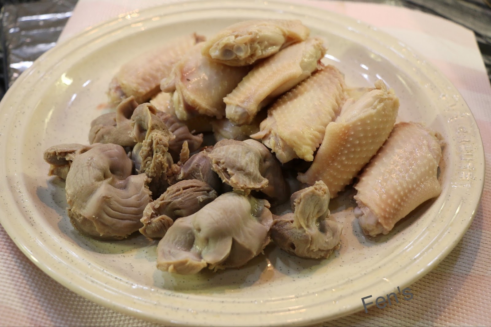15. 將雞翼、雞腎和鮑魚取出,雞腎切片,淋入蔥油沙薑汁拌勻即可。