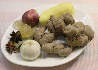 16. 留下來的沙薑滷水汁可用來做沙薑豬手。豬手斬塊後氽燙去血污,加入滷水汁中燜煮45分鐘(若湯汁不夠可添加適量水和調味料)。