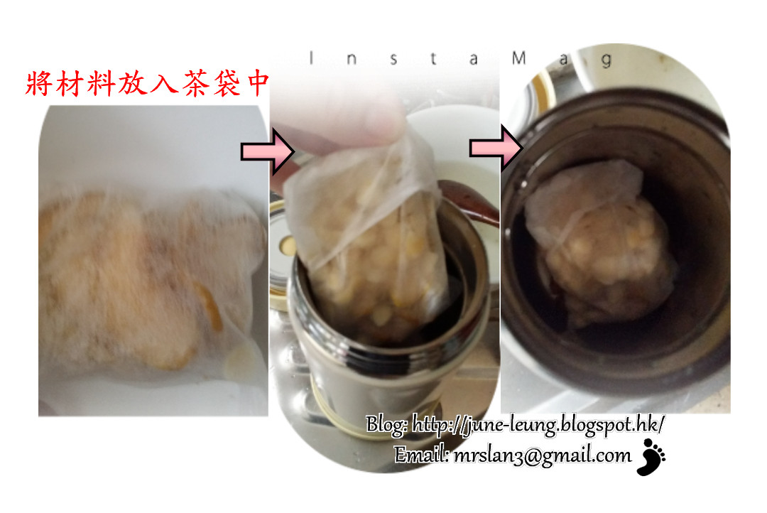 為免喝用時能只喝水的部份, 所以我將材料全部放入茶袋中(可以選擇不用的) 然後將整袋放入杯中, 再注入100度熱水, 然後焗1小時便可飲用!