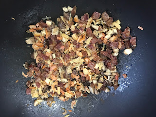 4. 預熱鑊加半湯匙油,先爆香臘腸蝦米,再加冬菇瑤柱絲炒香撈起備用