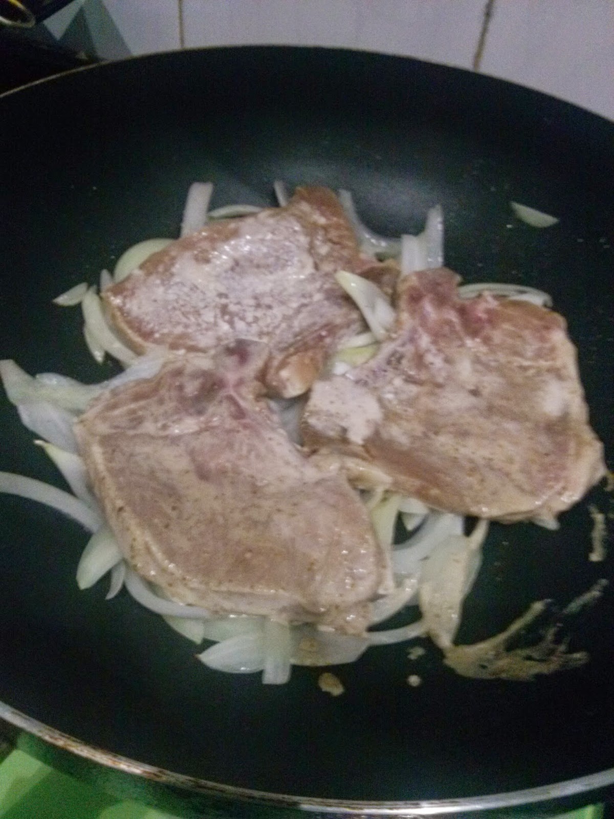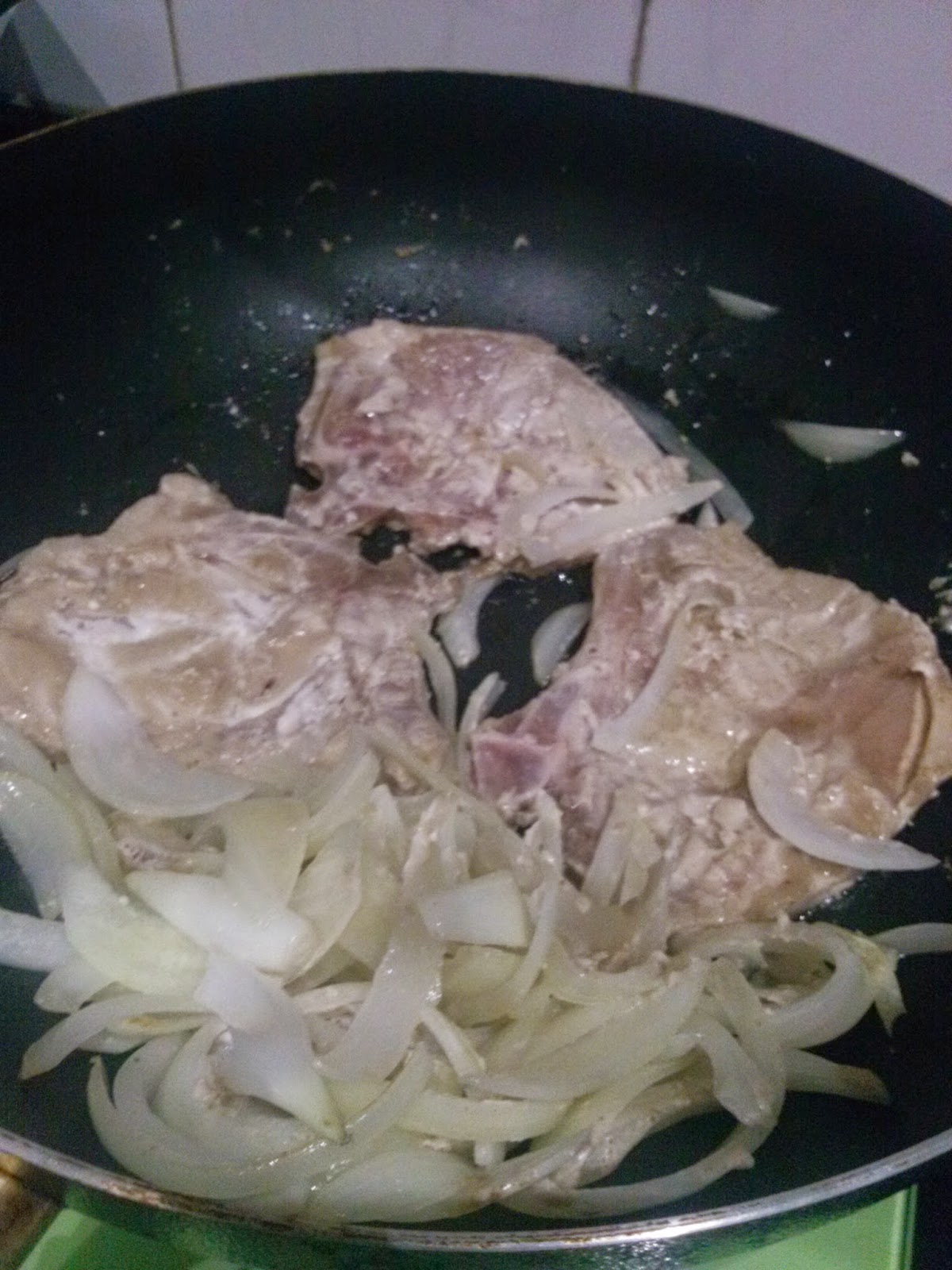 煎豬扒時pop上生粉, 先大火煎香2邊封鎖肉汁, 再用慢火煎熟, 最後用大火煎出脆脆豬扒