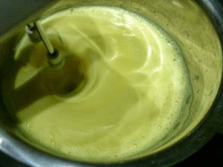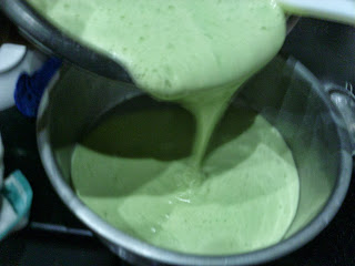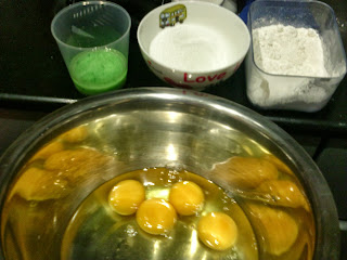 撈勻後將一部份加入班蘭油中撈勻(因直接倒入糕糊會令蛋糊下沈, 做出來的蛋糕就不會鬆軟而且會好實