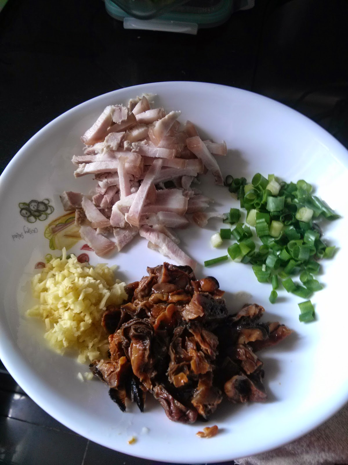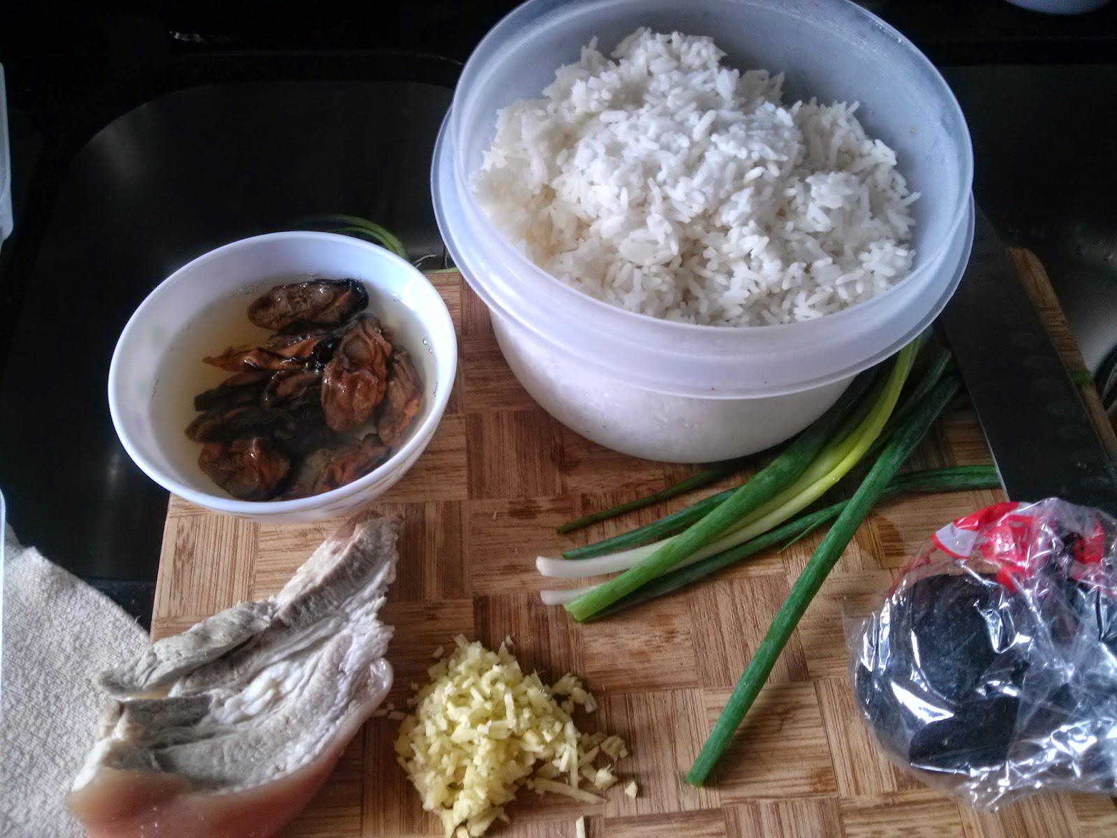 材料: 飯2碗, 蠔豉8-10只, 咸肉一件, 咸蛋一只, 薑蓉一湯匙,