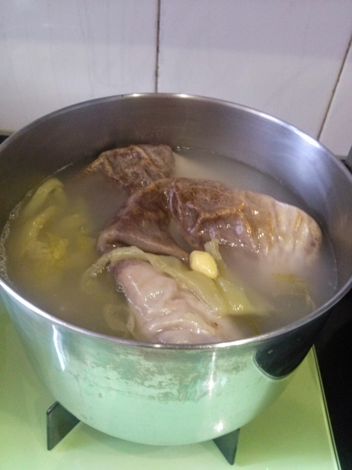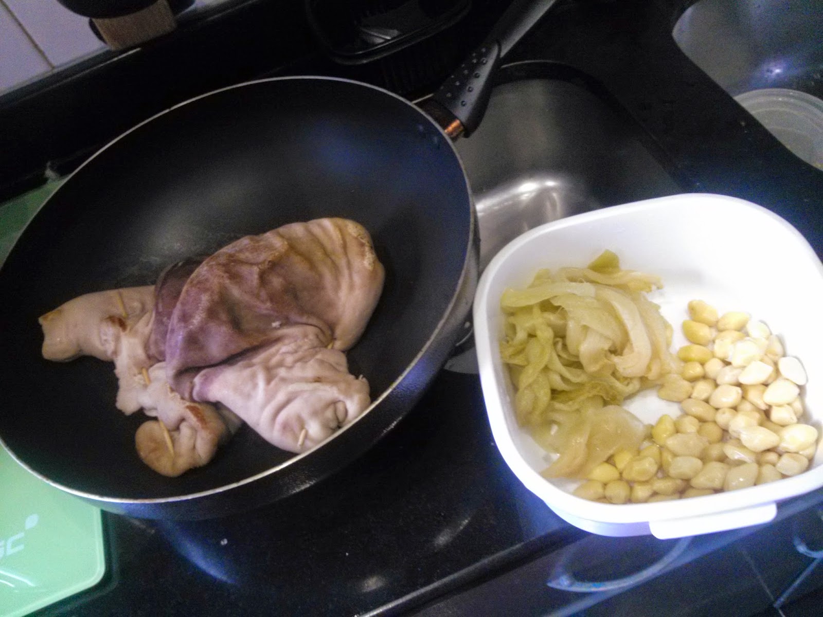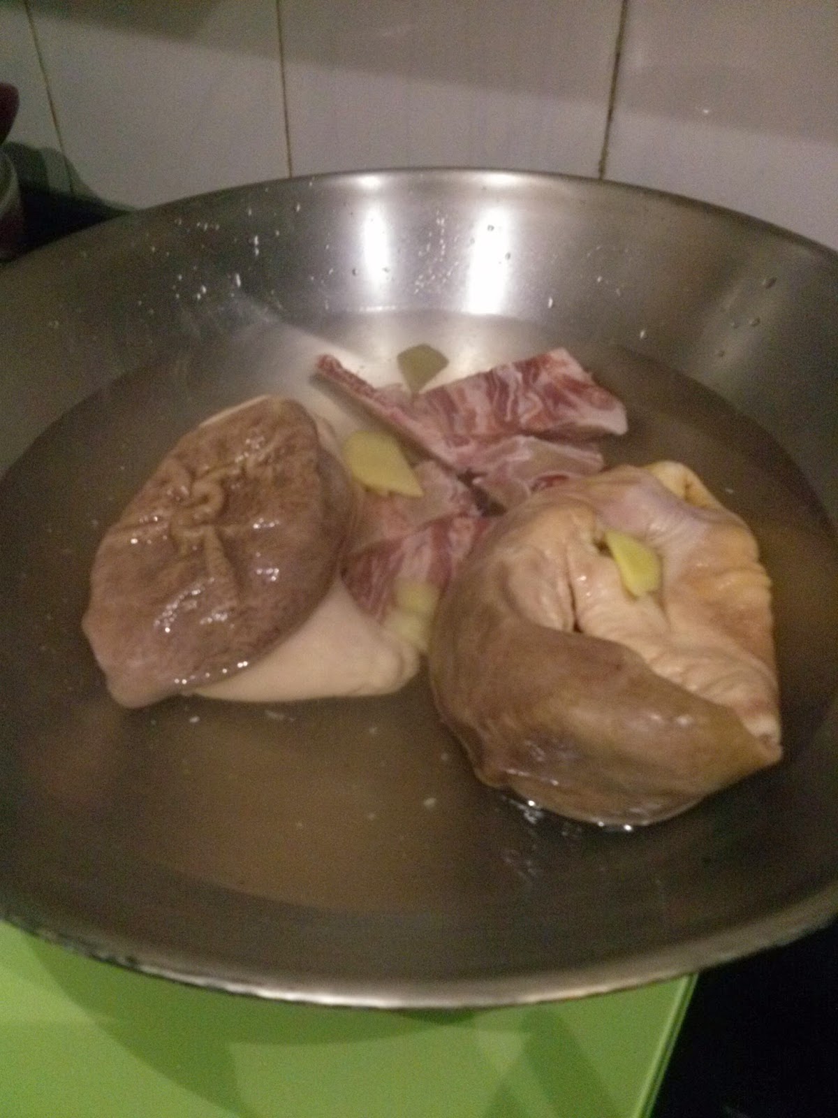 買返來的豬肚未必解左凍, 就先用鹽水浸, 快速解凍而且去除雪味, 解凍好豬肚就先用幾片薑同凍水一齊煲