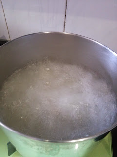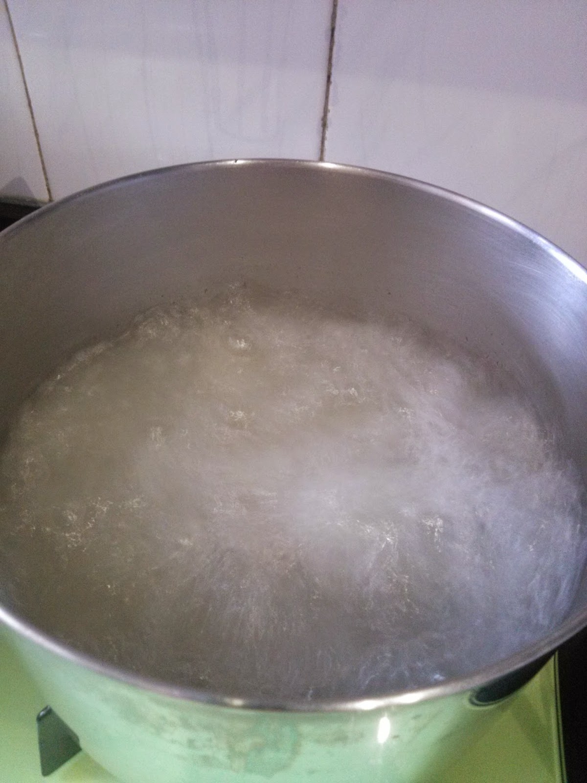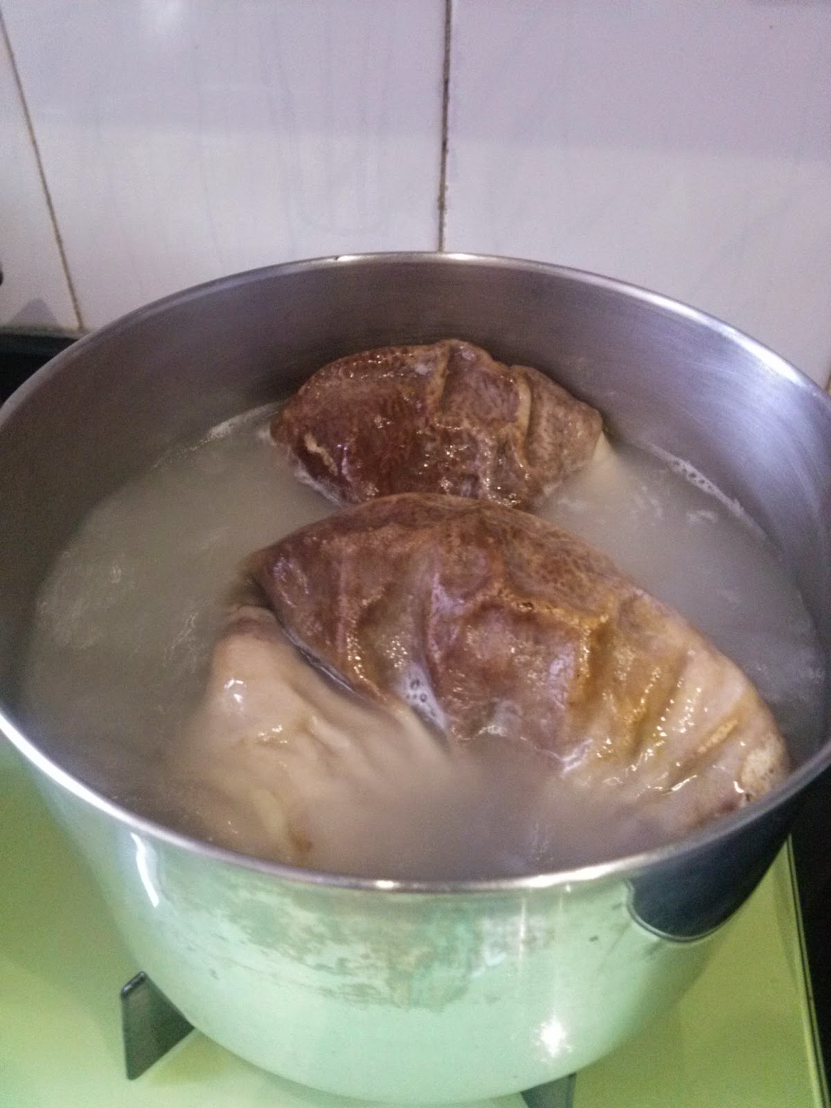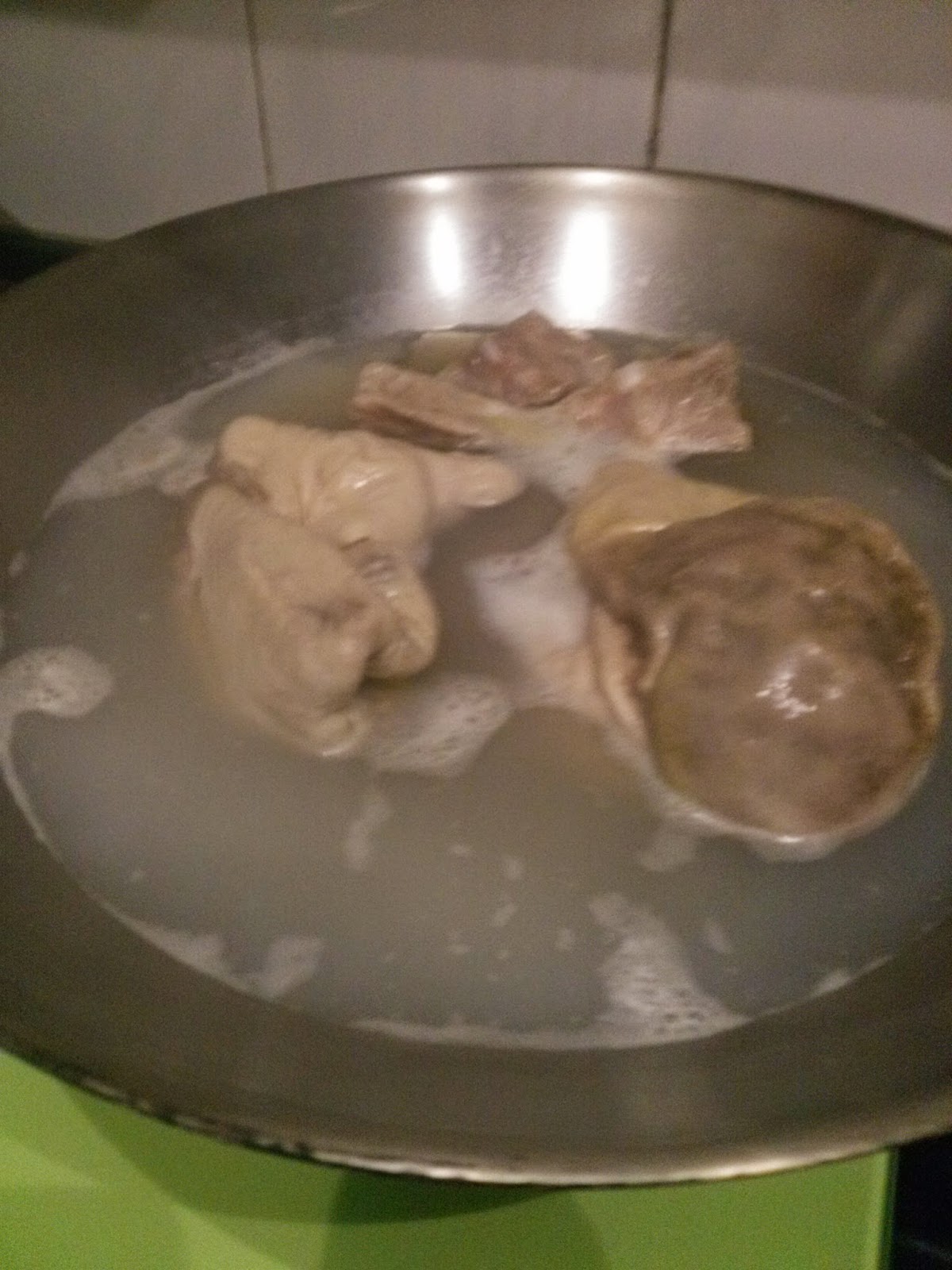 買返來的豬肚未必解左凍, 就先用鹽水浸, 快速解凍而且去除雪味, 解凍好豬肚就先用幾片薑同凍水一齊煲