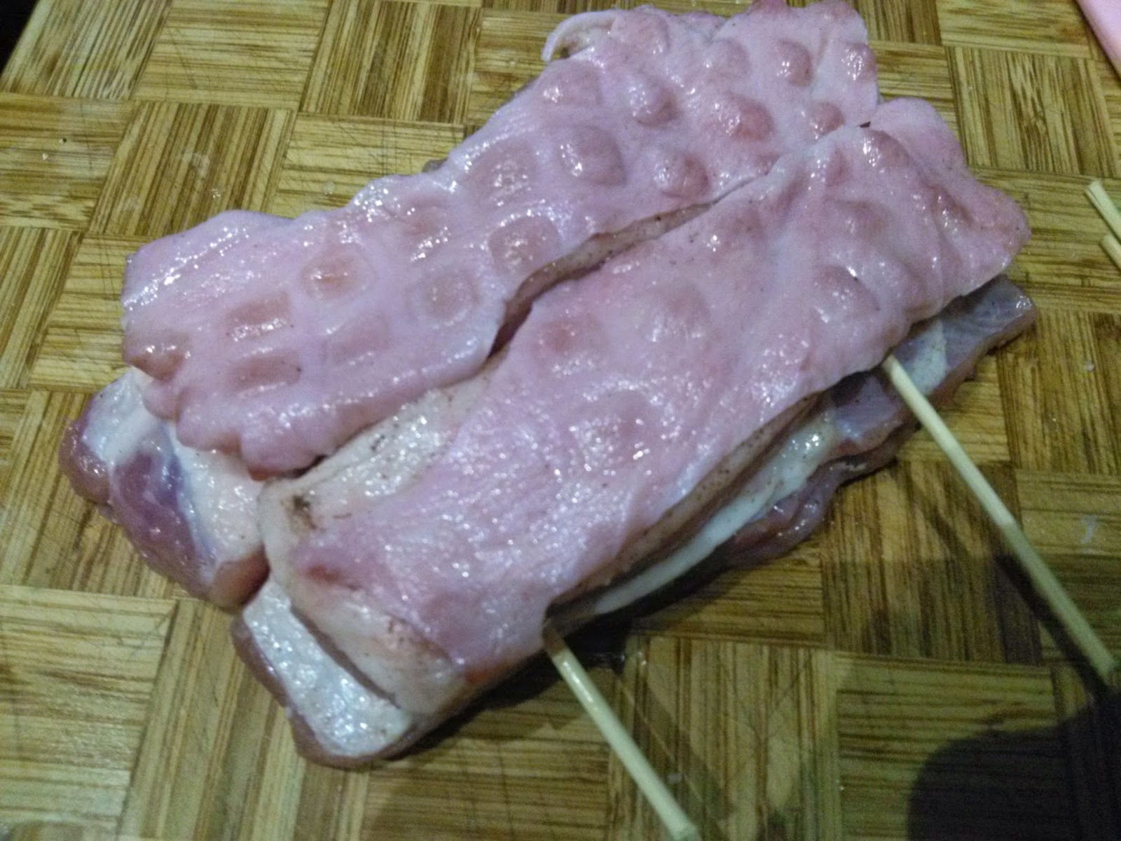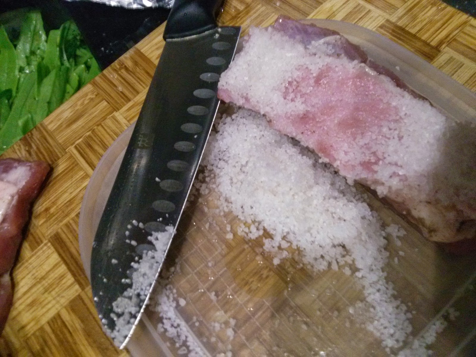 pop鹽前因我生手, 所以我通常都用碭紙包肉身只見到豬皮, 因為之前做過鹽趺左入去會好咸, 如果買到件四四方方就容易可以唔需要
