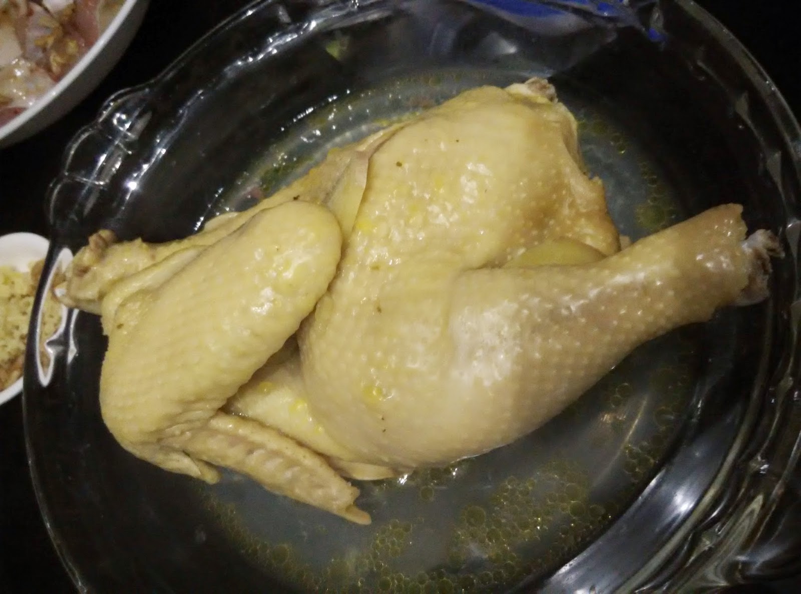 2) 蒸好或焗好的雞可插入竹簽在脾位無血水溜出就熟